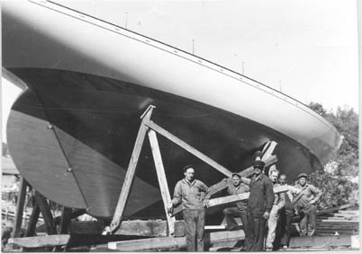 ![]() Arbetslaget samlas framför Galene innan sjösättningen skall ske. 110m2 Havskryssare Byggd 1937.